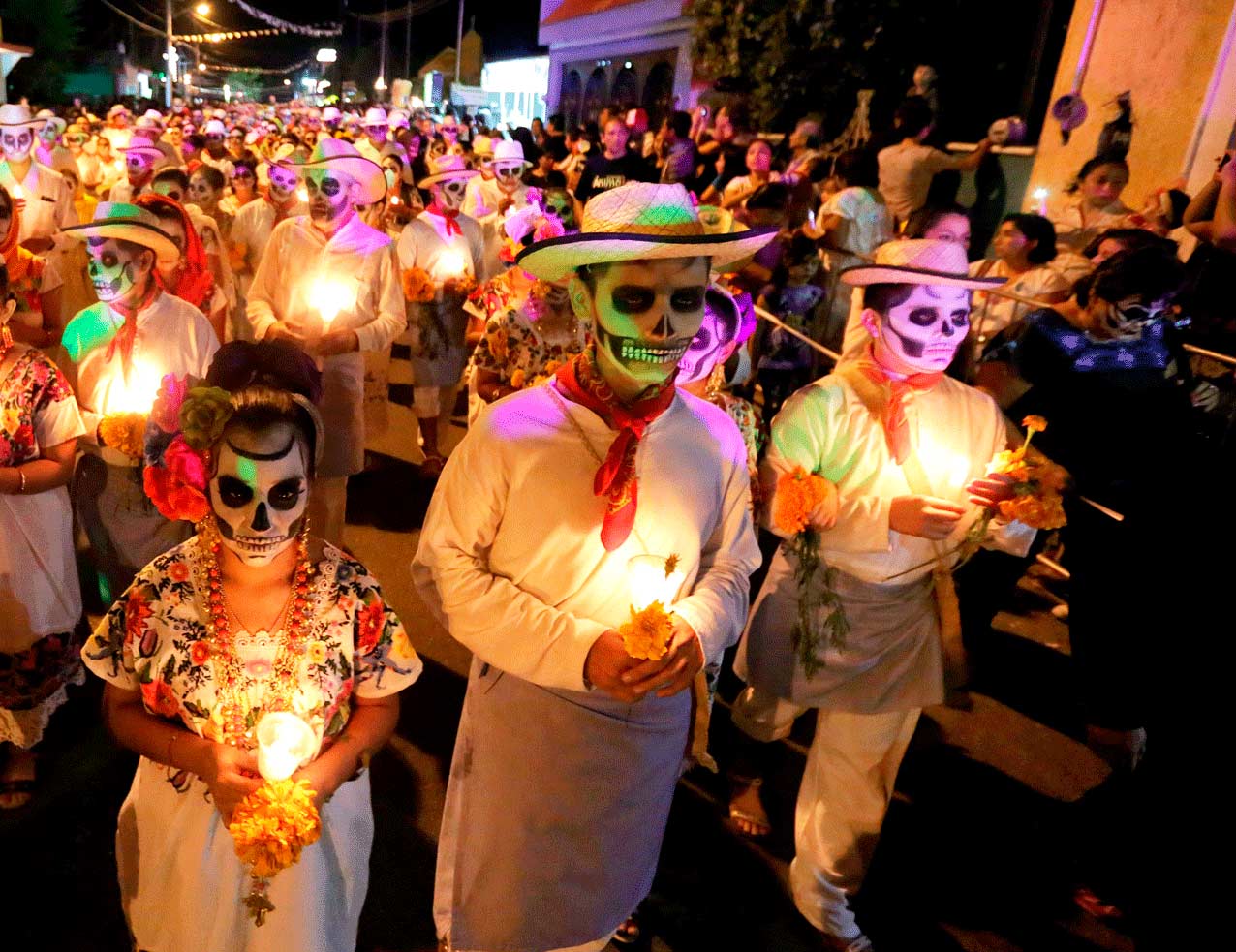Estos días se caracterizan por el olor a incienso, las ofrendas de los altares, las calaveritas (cráneos de caramelo), las flores de cempasúchil, las velas, los rezos y la música que acompaña a los bailarines de danzas préhispánicas.